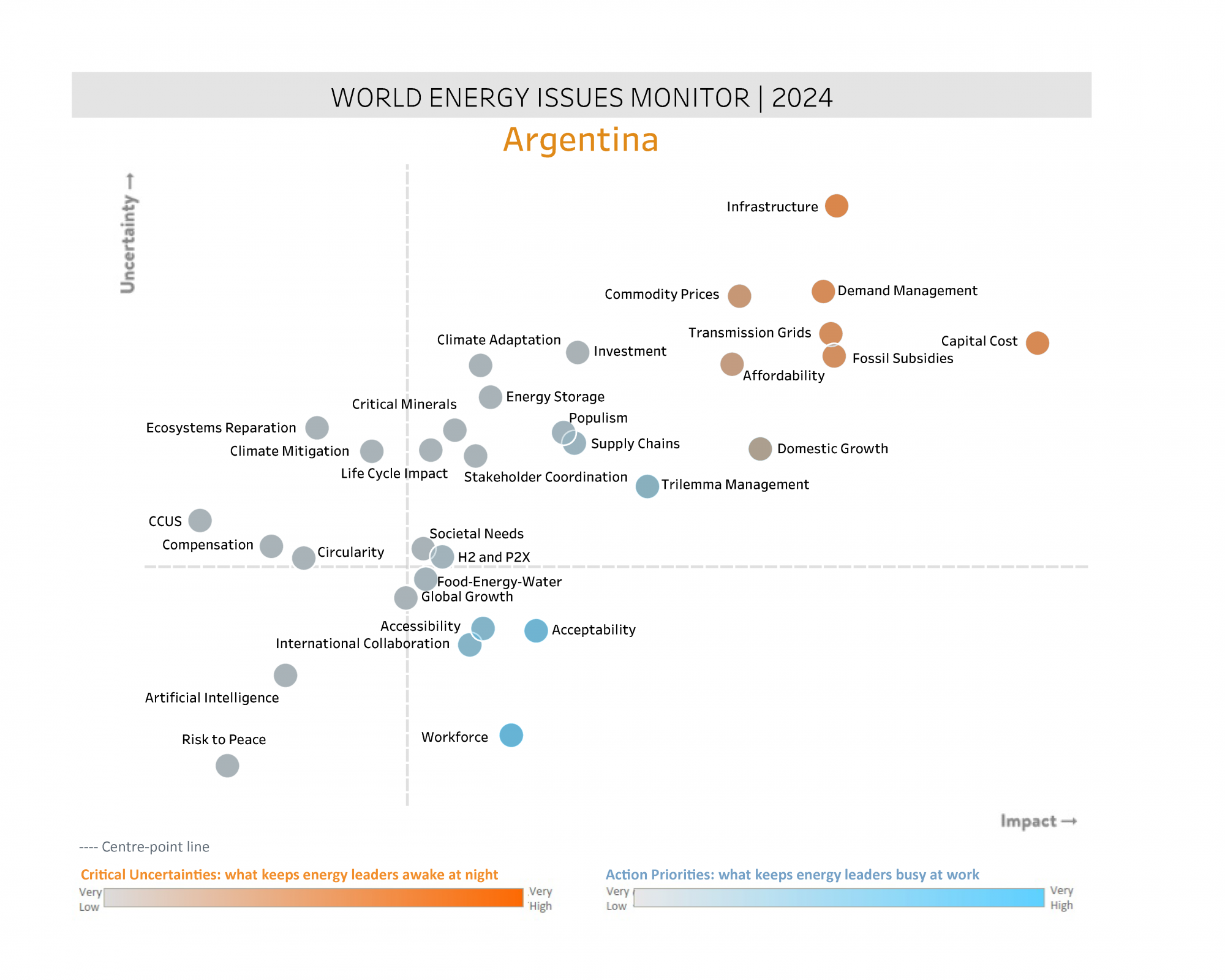 Over the past 5+ years, Argentina has steadily increased its penetration of renewable energies while simultaneously developing the Vaca Muerta unconventional oil and gas field. Vaca Muerta is one of the world's largest shale reserves, crucial for Argentina's energy strategy and economic growth. However, the country's infrastructure, particularly natural gas pipelines and transmission grids, poses challenges to the reliability and secure supply of natural gas and the integration of higher shares of renewable energies. In 2022, the top critical uncertainty identified by the country was investor environment and economic growth. With an inflation above 100%, and a complex macroeconomic context in 2023, attracting investments is still a challenge that the new government must face.
