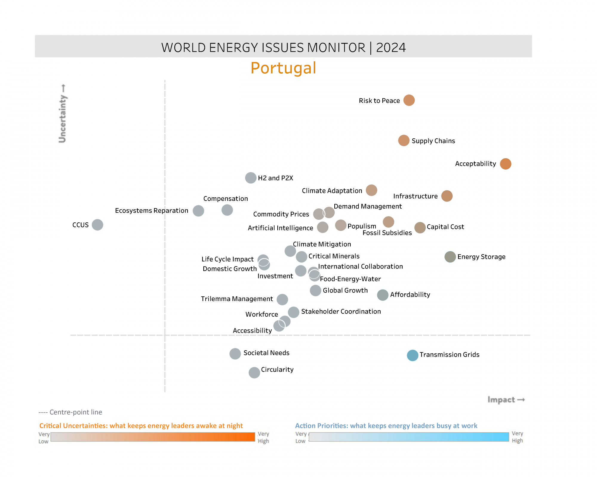 When comparing the top five uncertainties of the 2022 and 2024 Portugal Issues Survey results, there are no common issues. This remarkable difference may signal a considerable change in the business environment, and reflect adjustments to higher costs resulting from the supply crisis, inflation, and the pandemic, as well as the effects of recent wars. Additionally striking is the fact that all the top five priorities in 2024 are new issues, not present (at least as such) in the 2022 survey. One of these, ‘Acceptability,’ relates to the 'social license' to operate, now becoming prominent.